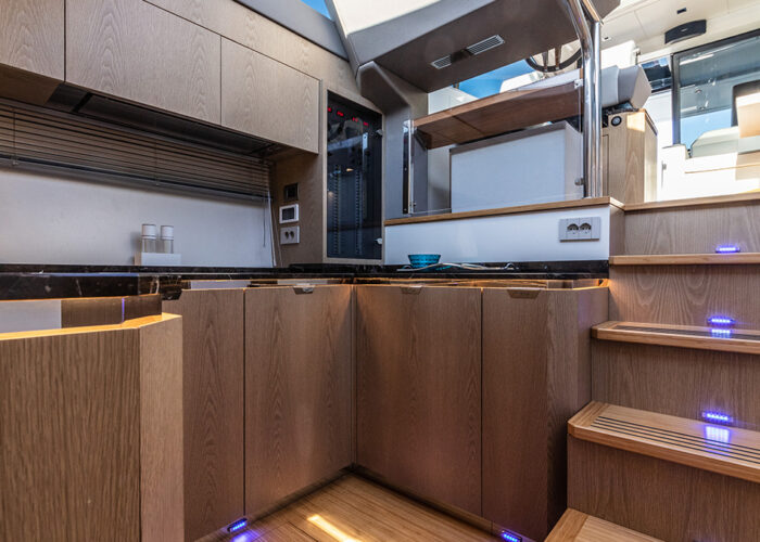 L’intérieur du 58 Sport Coupé est un véritable sanctuaire de luxe et de confort. L’espace de vie est soigneusement conçu, avec une cabine principale dotée d’un lit king-size et d’une salle de bains privative, offrant de nombreux rangements pour maximiser l’espace. Les cabines d’invités, également bien équipées, offrent un espace de couchage confortable, garantissant que vos invités se sentiront à l’aise tout au long de leur séjour à bord. Chaque détail, des matériaux aux finitions, a été choisi pour créer une atmosphère accueillante et raffinée.