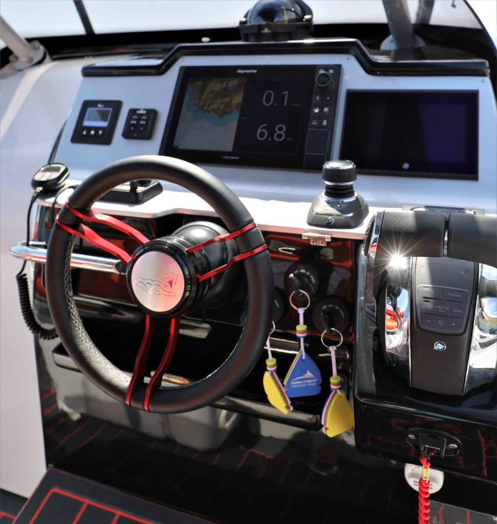 Le poste de pilotage est aéré avec deux sièges baquets. Des repose-pieds en forme de tube escamotable sont alignés au sol. Le tableau de bord est très joliment dessiné avec une organisation très fonctionnelle. Les deux écrans de la centrale de navigation (Raymarine et SmartCraft) s’intègrent facilement face au pilote, de même que la VHF fixe et le gros compas.