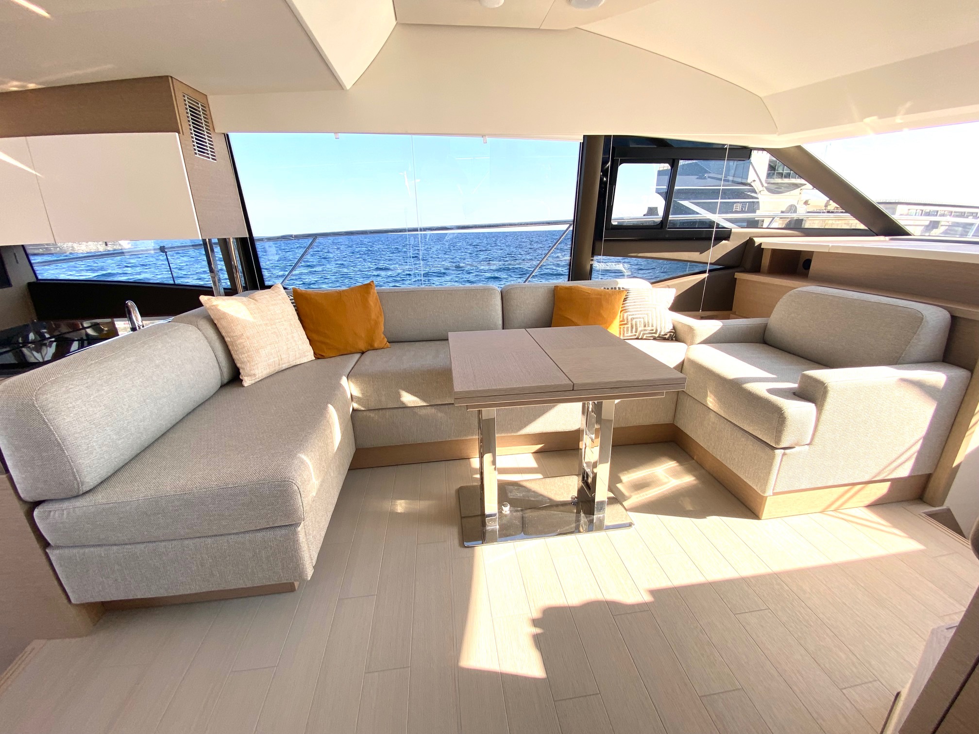 - Finitions premium : tauds de protection (fly, pare-brise, table), bimini, coussins et banquettes extérieurs, éclairage de cockpit, table de cockpit fixe, nombreux rangements, passerelle hydraulique et plateforme de bain.