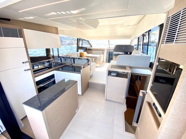 - Confort à bord : climatisation réversible, générateur, lave-linge, lave-vaisselle, micro-ondes, four, grand réfrigérateur/congélateur, chauffe-eau, WC électriques, vaste flybridge, bains de soleil avant & arrière, cockpit et plateforme de bain hydraulique en teck pour des moments inoubliables au mouillage.